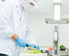 野菜のカット加工。栄養士の方の設計に沿うように、ミリ単位・グラム単位でのカットを行っております。また、病院食を食べられる方に美味しくいただていもらうため、極力機械は使わず手作業でのカットし、素材の旨味と栄養を逃さない加工を心がけております。
